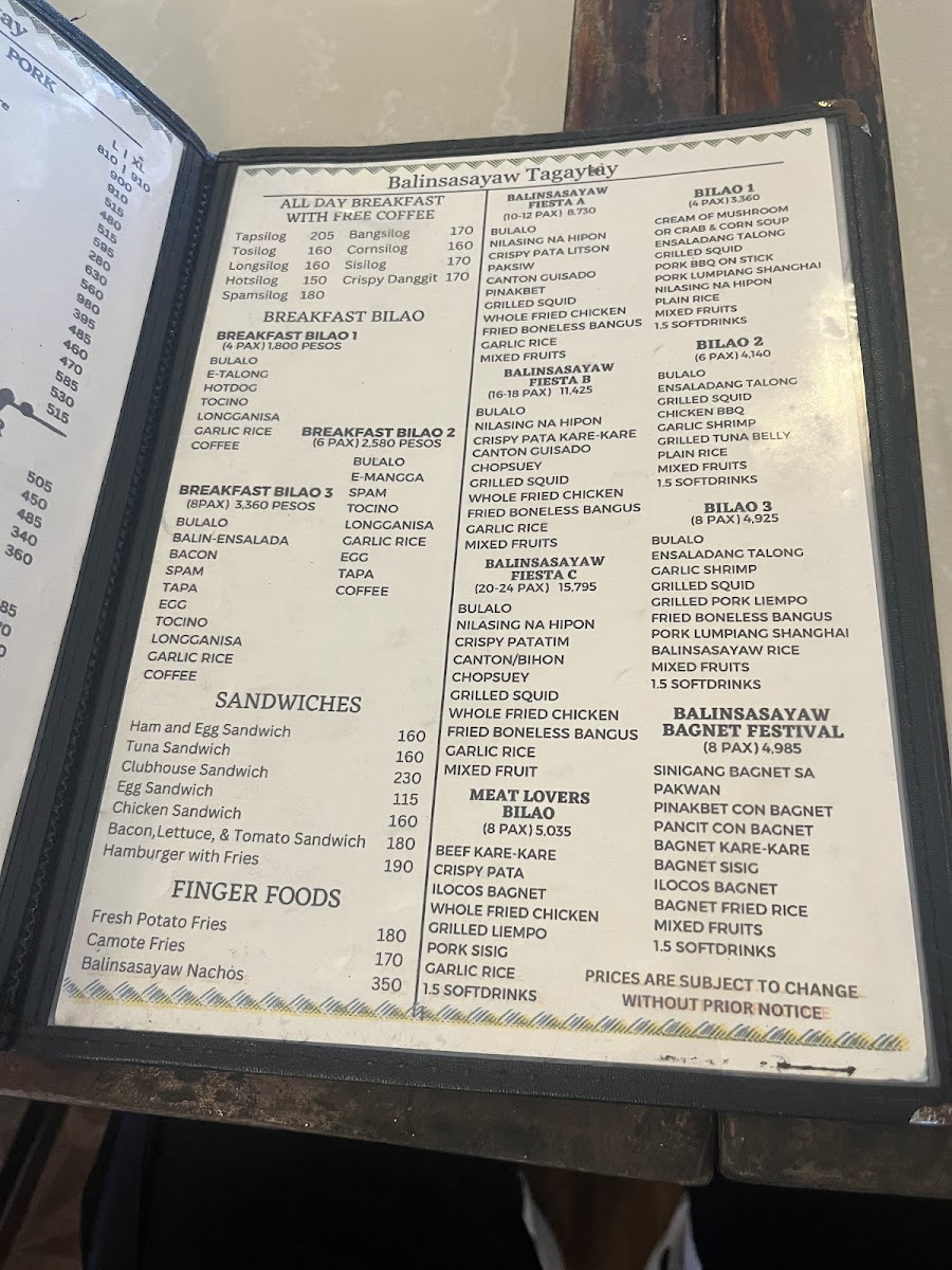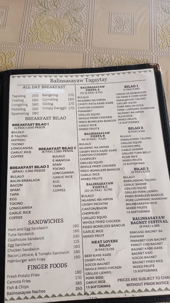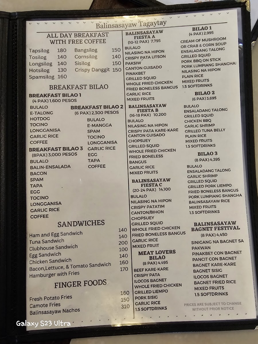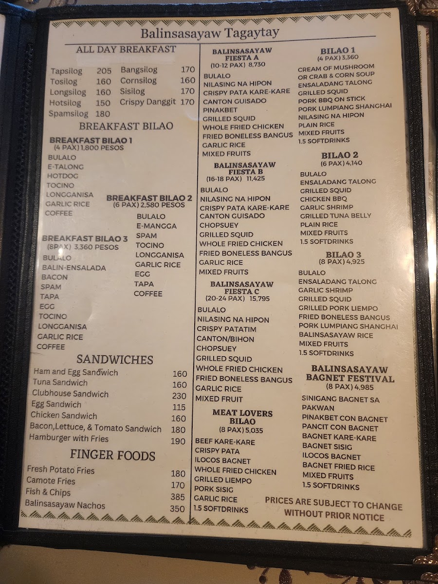 When you step into Balinsasayaw - Alfresco Dining & Cafe, you're in for more than just a meal; it's a full experience. Located along the Tagaytay-Nasugbu Highway in Tagaytay City, Cavite, this charming spot offers a welcoming alfresco setting where you can enjoy your food while taking in the fresh air and beautiful views. The menu here blends local flavors with a touch of creativity, ensuring that there's something for everyone. Whether you're craving hearty Filipino classics or looking to try something new, you’ll find plenty of options to satisfy your appetite. From fresh salads and flavorful appetizers to savory main dishes and indulgent desserts, each plate is crafted with care, using the best ingredients. Every visit promises not only delicious food but also a relaxing atmosphere, perfect for sharing a meal with friends or family. It's the ideal place to enjoy comforting dishes in a laid-back, open-air setting.